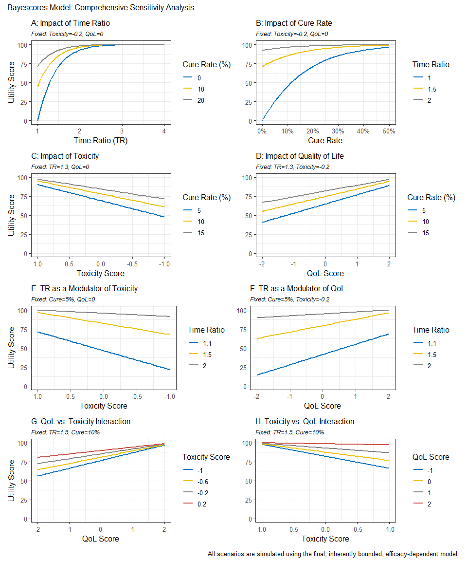 • Integrates multiple dimensions: combines efficacy, toxicity, and quality of life within a unified decision-analytic framework (MAUT), with hierarchical aggregation that mirrors clinical reasoning: efficacy first, then QoL, then toxicity.
