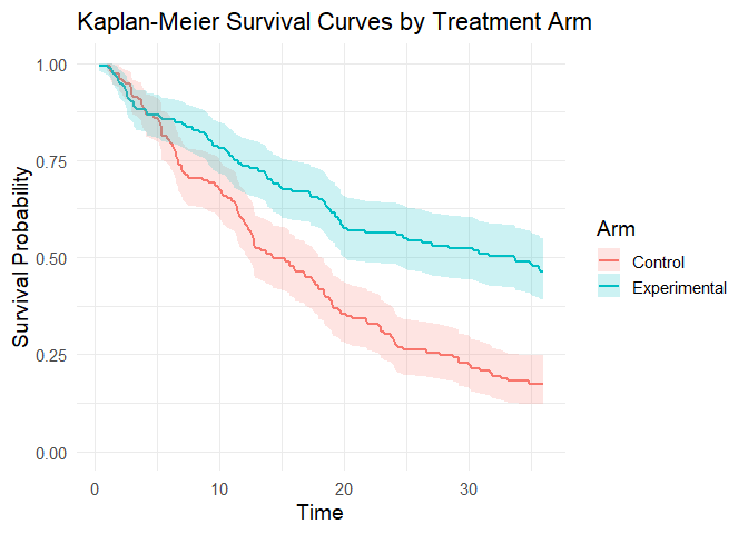 To illustrate how our package addresses this, we use a toy example specifically designed to mimic these conditions of uncertainty. We simulate a 300-patient trial with promising long-term survival fractions (40% in the experimental arm vs. 15% in the control), but with the maximum follow-up limited to 3 years.